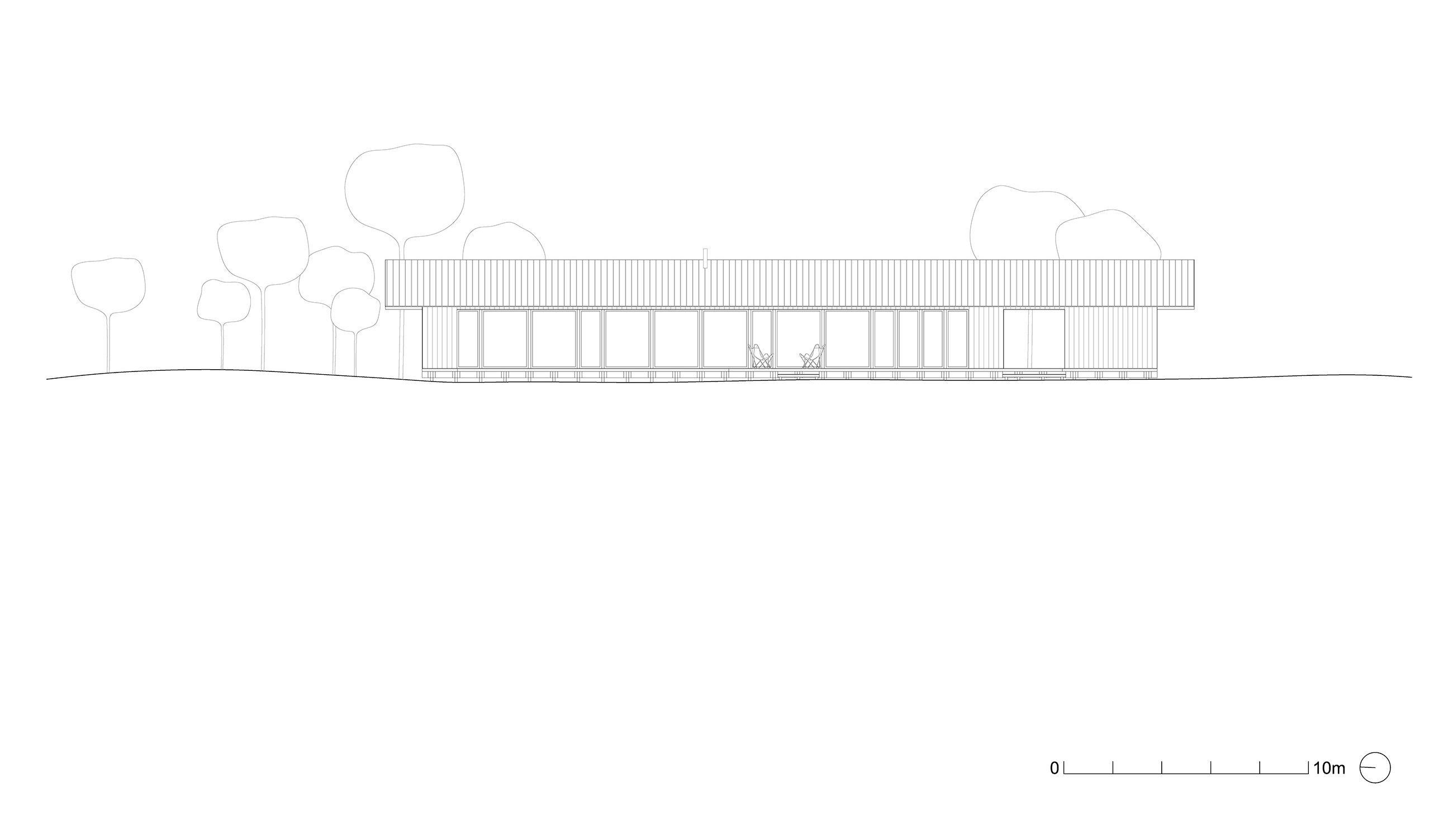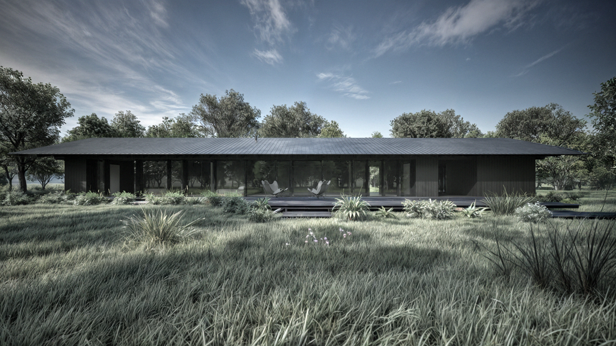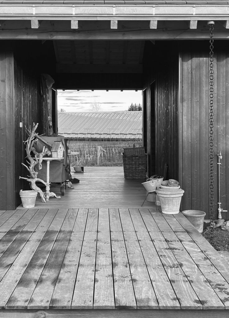 A central passage divides the house into two wings beneath one continuous roof — a simple, deliberate gesture that anchors the building in its landscape. The material palette is raw and authentic, highlighting the texture of the charred wood and the subtle play of light across its surface. Inside, spaces flow fluidly toward the garden, fostering an immediate and intimate connection with nature.