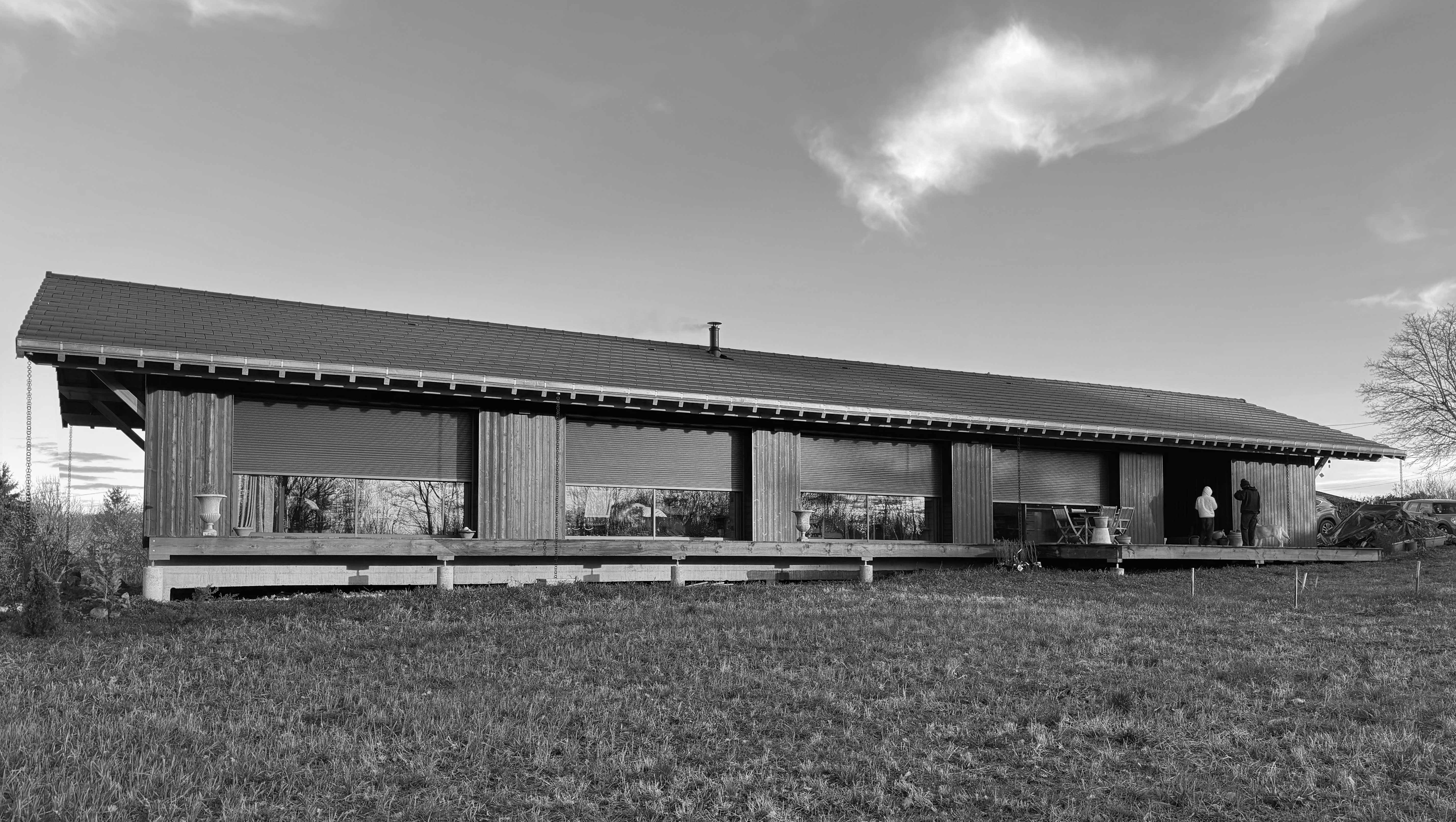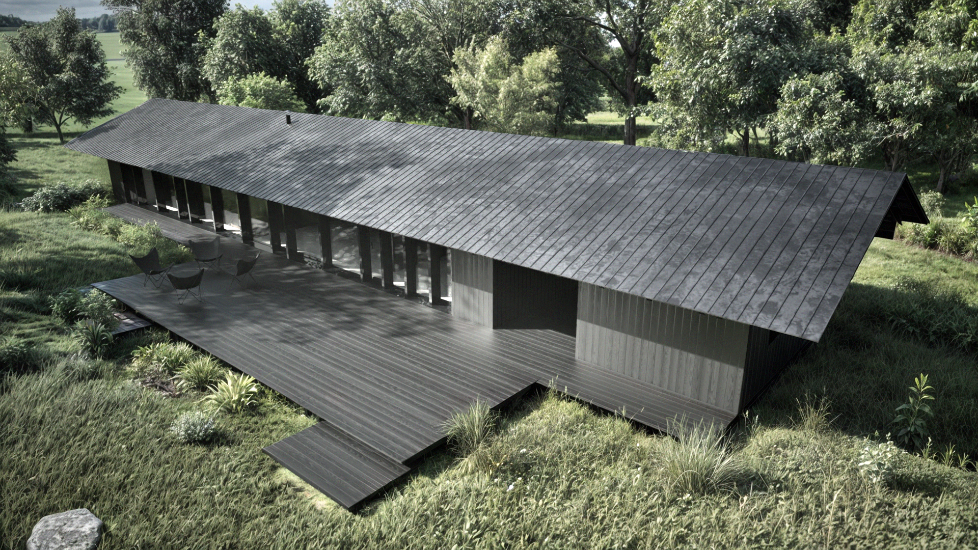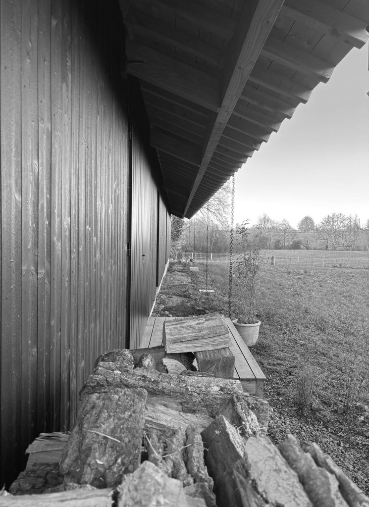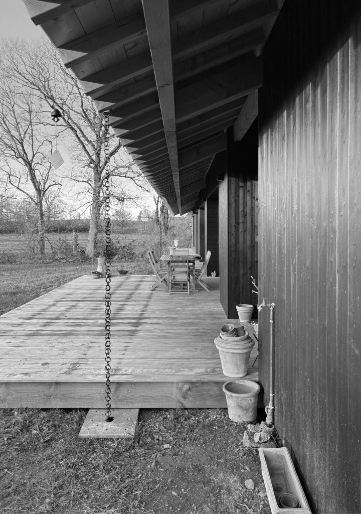 Final Construction 2026. The French House is a timber construction built using the traditional Japanese technique of shou sugi ban, where wood is charred to enhance both its durability and natural beauty. Set in the quiet countryside of Auvergne, the façade facing the road remains almost entirely closed, ensuring privacy and serenity, while the garden side opens wide to capture the warmth of the afternoon and evening sun.