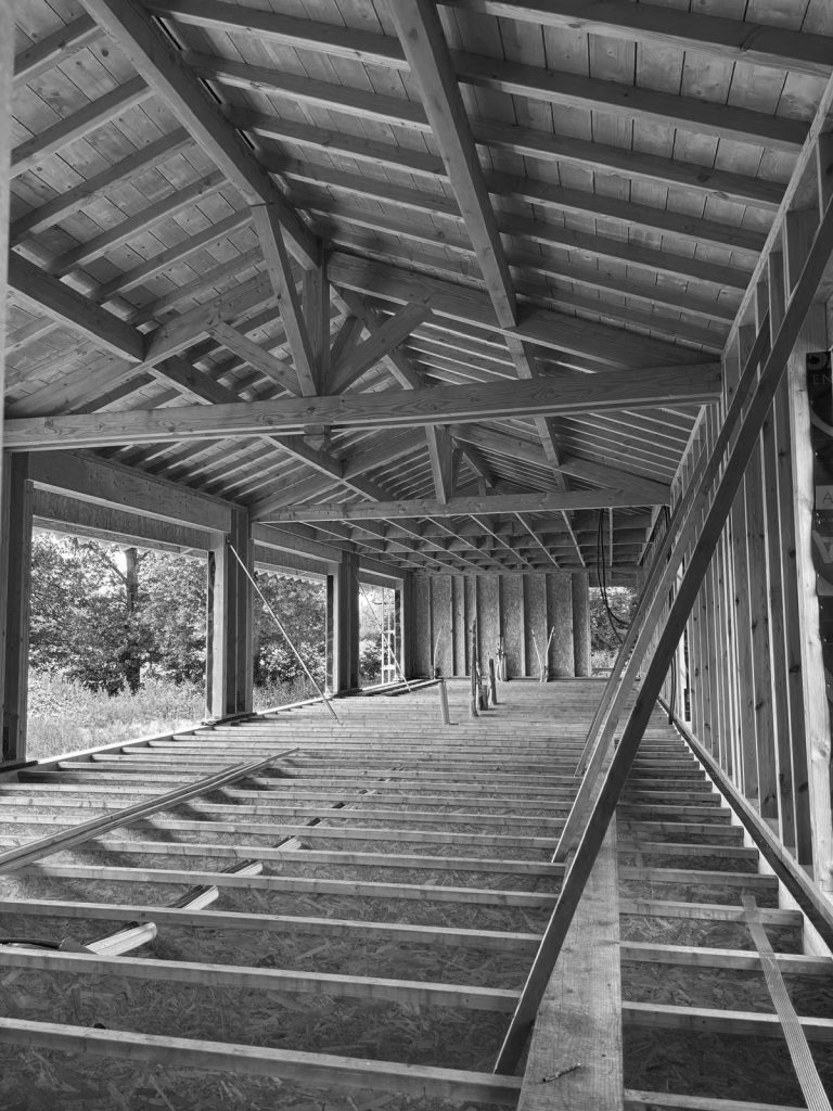 The wooden structure of the house is gradually taking shape: walls, floor, and roof already outline the house’s clear, simple, and precise volume.