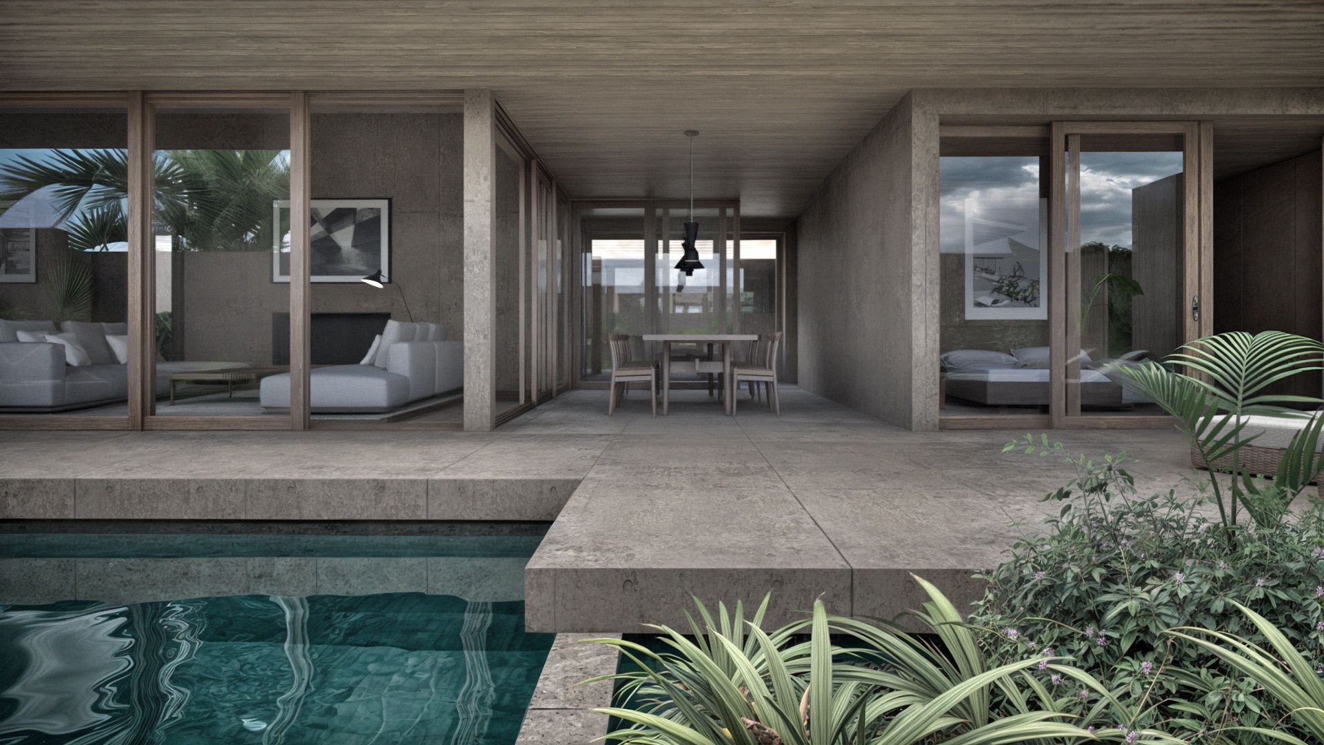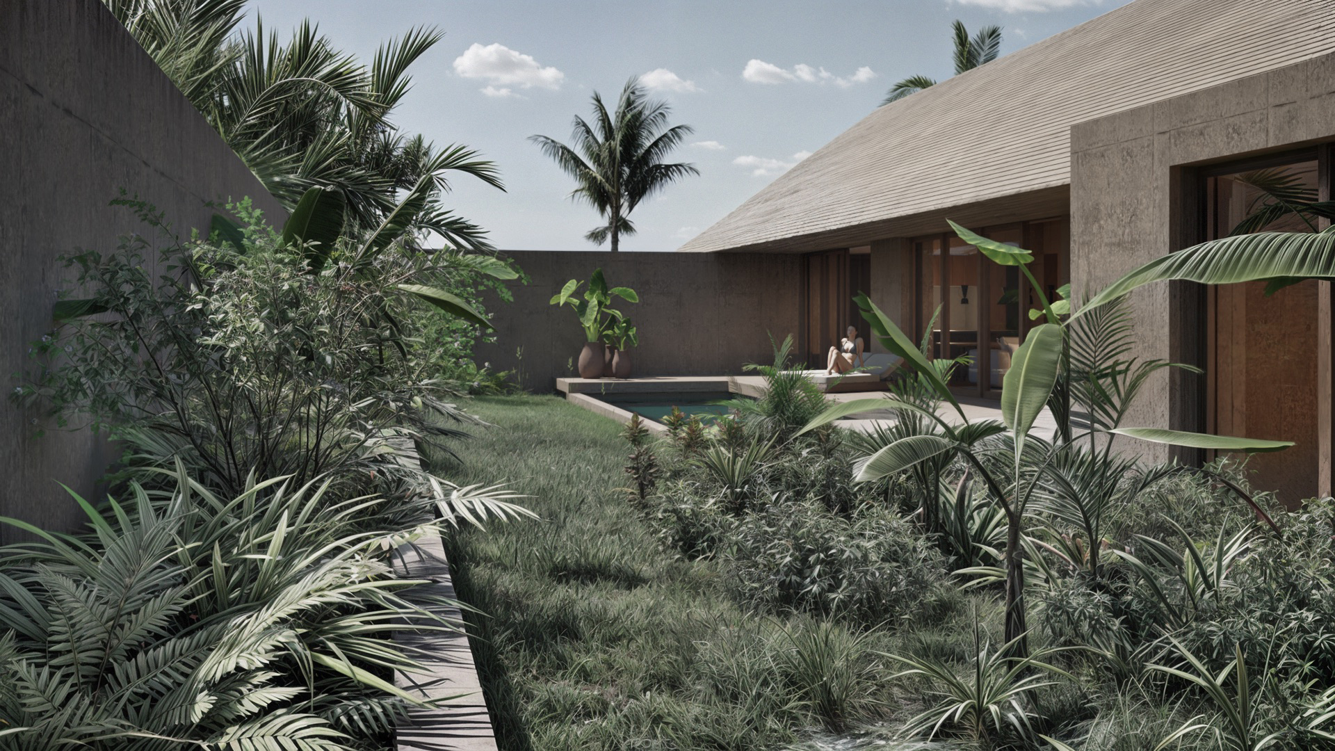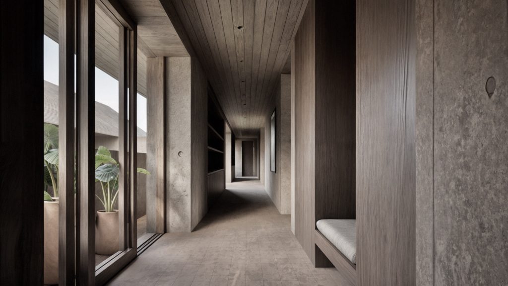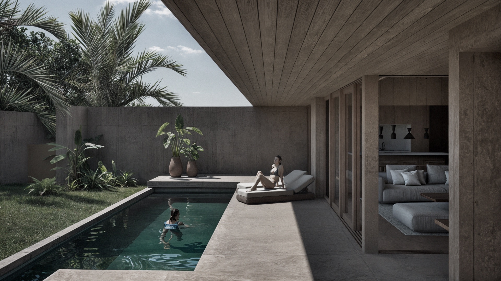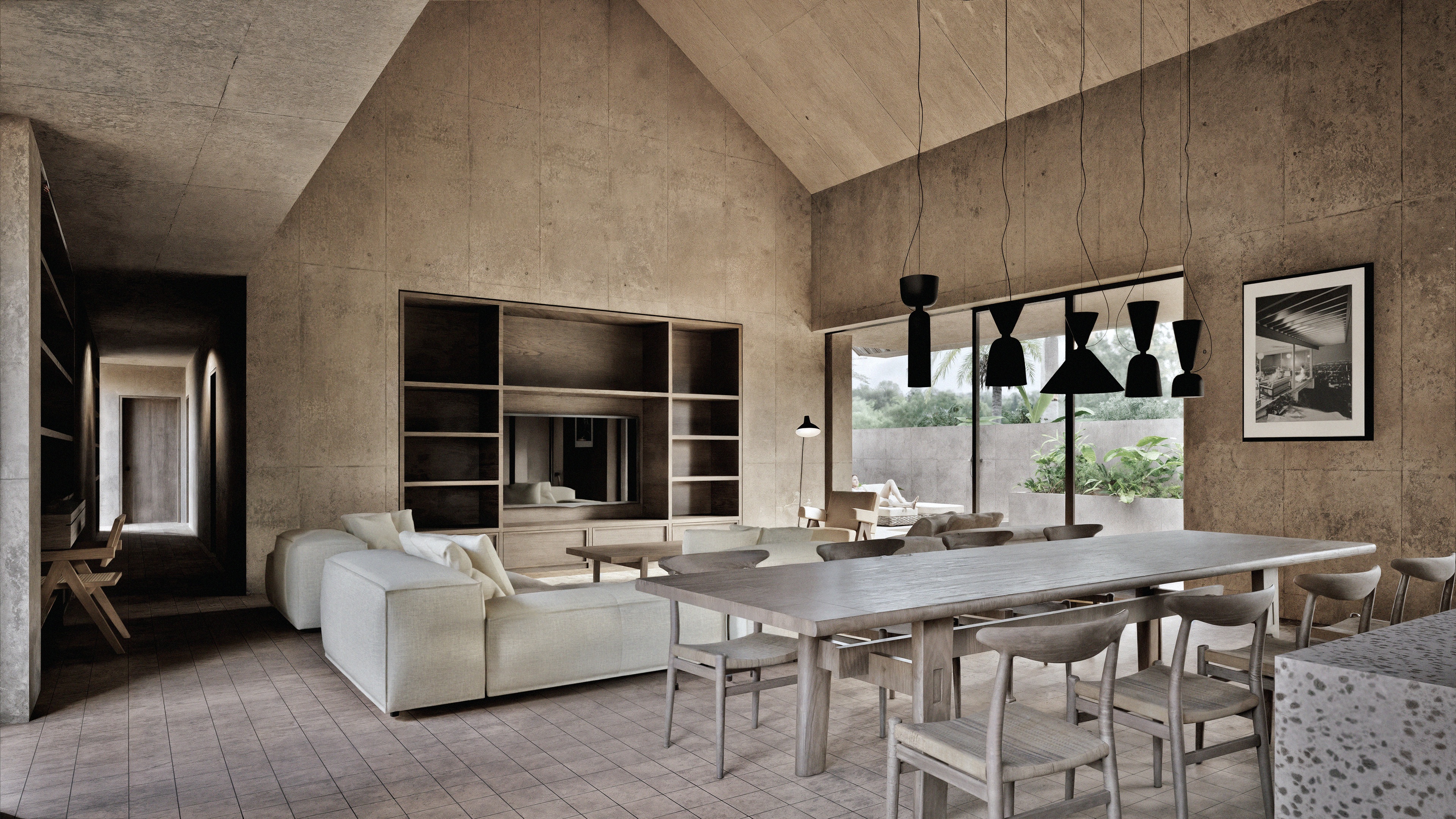 Natural materials — concrete, timber, and linen — create a serene palette that softens the transition between interior and exterior. Light filters through generous openings, shaping spaces that feel both protected and open to the landscape.