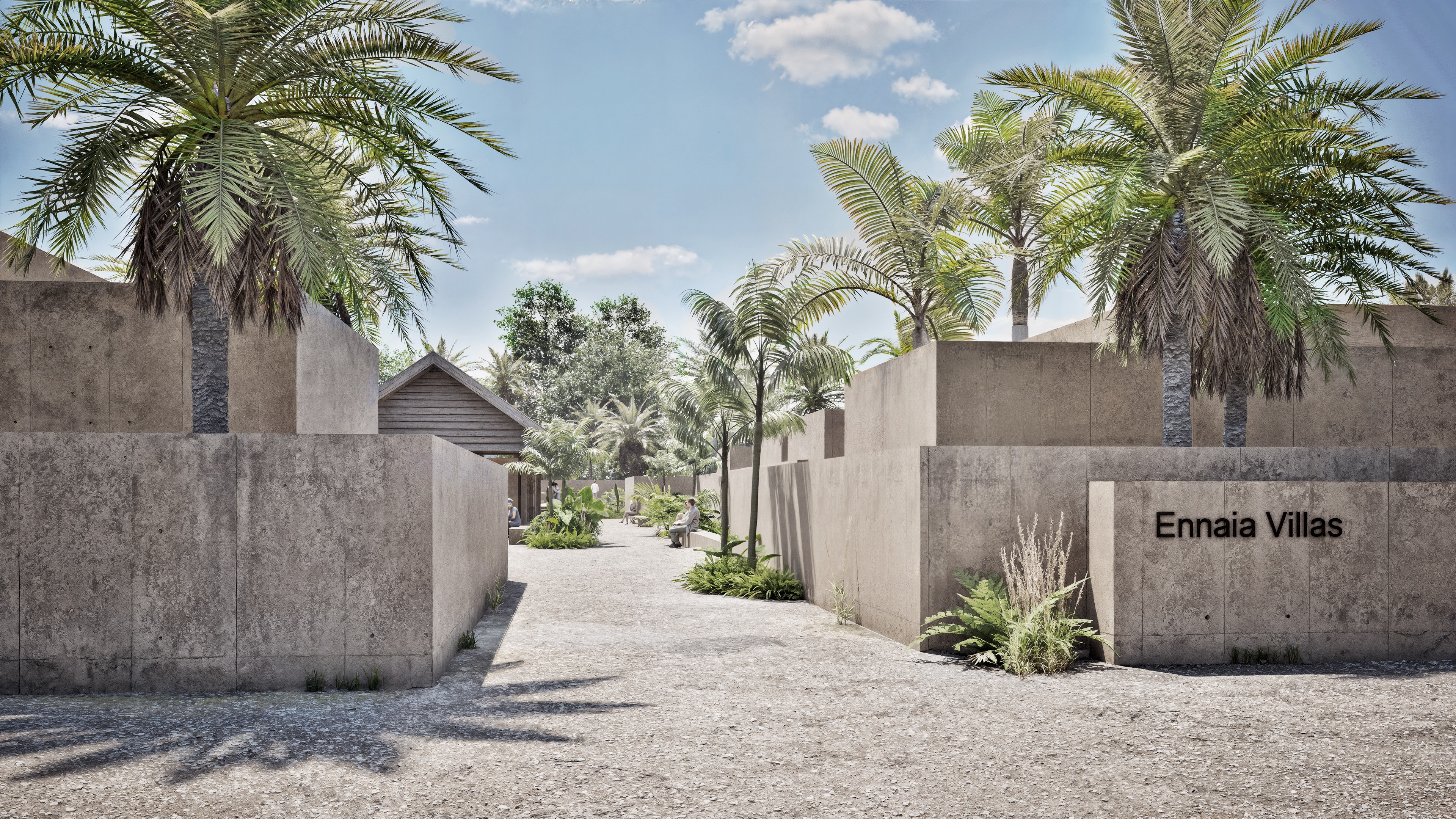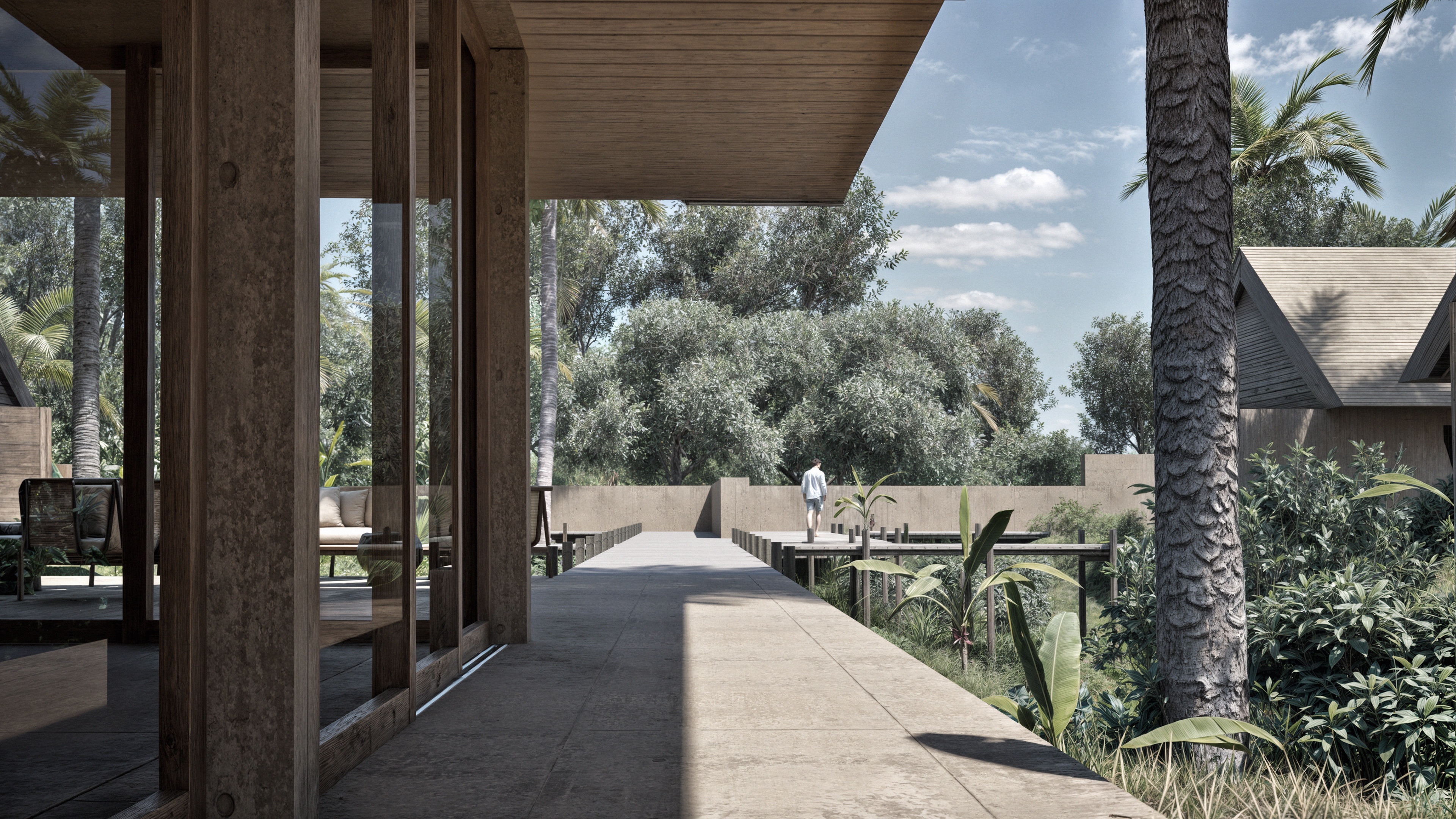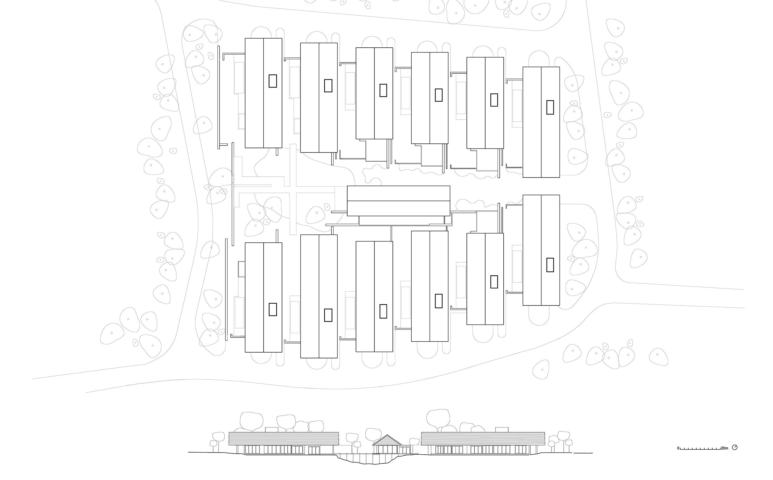 A series of grounded walls carve the landscape, defining each home while uniting them beneath a continuous, overhanging roof. This language of walls, openings, and rooflines establishes a sense of rhythm and connection across the site.