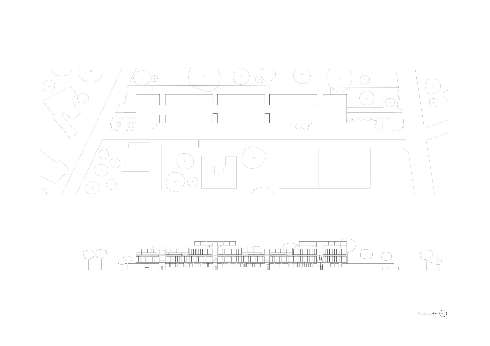 The building’s material language is deliberately honest — smooth concrete frames filled with board-formed walls and full-height glazing that invite light deep into the interiors. These contrasts give the spaces a quiet rhythm and a strong connection to their surroundings.