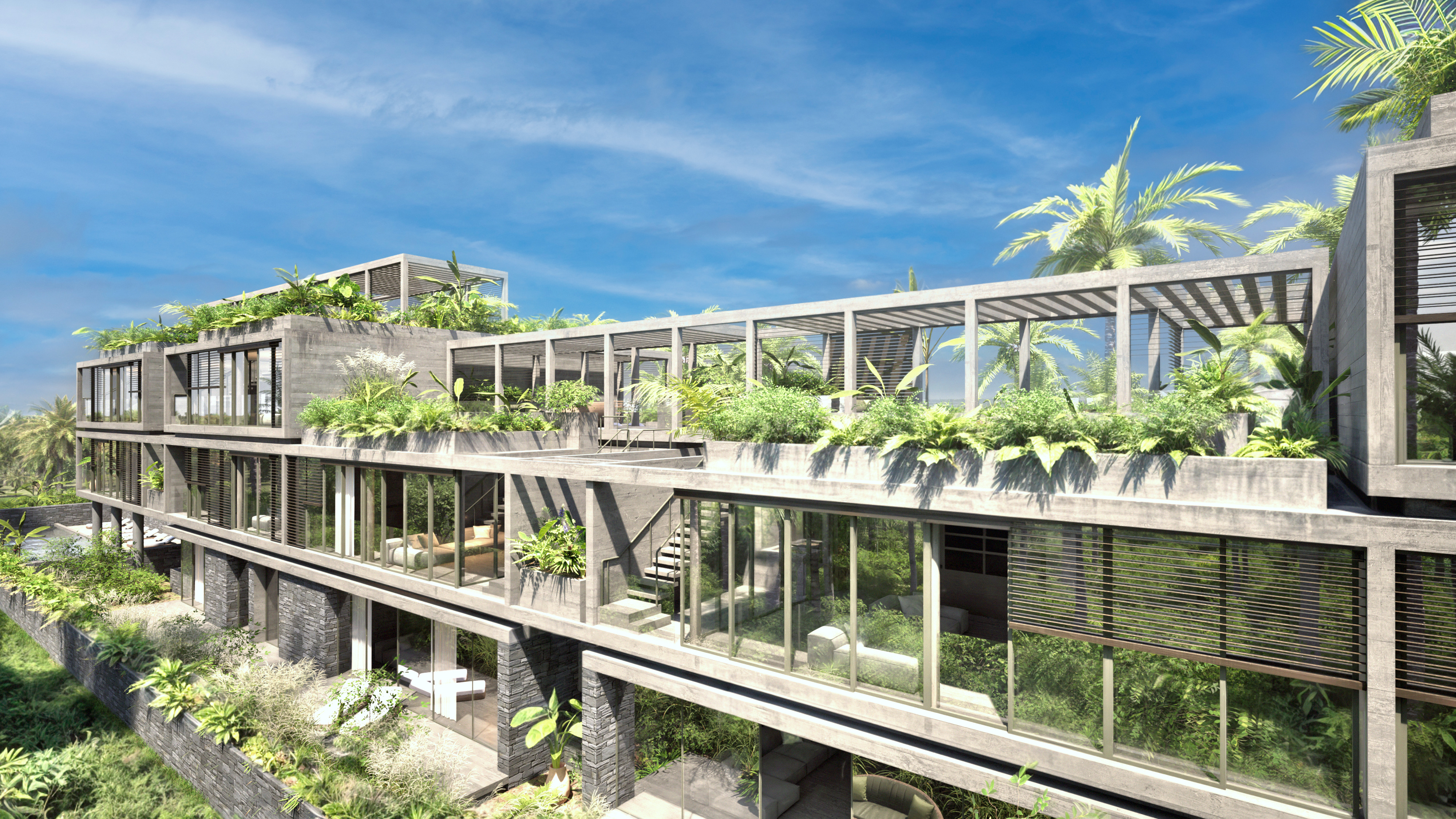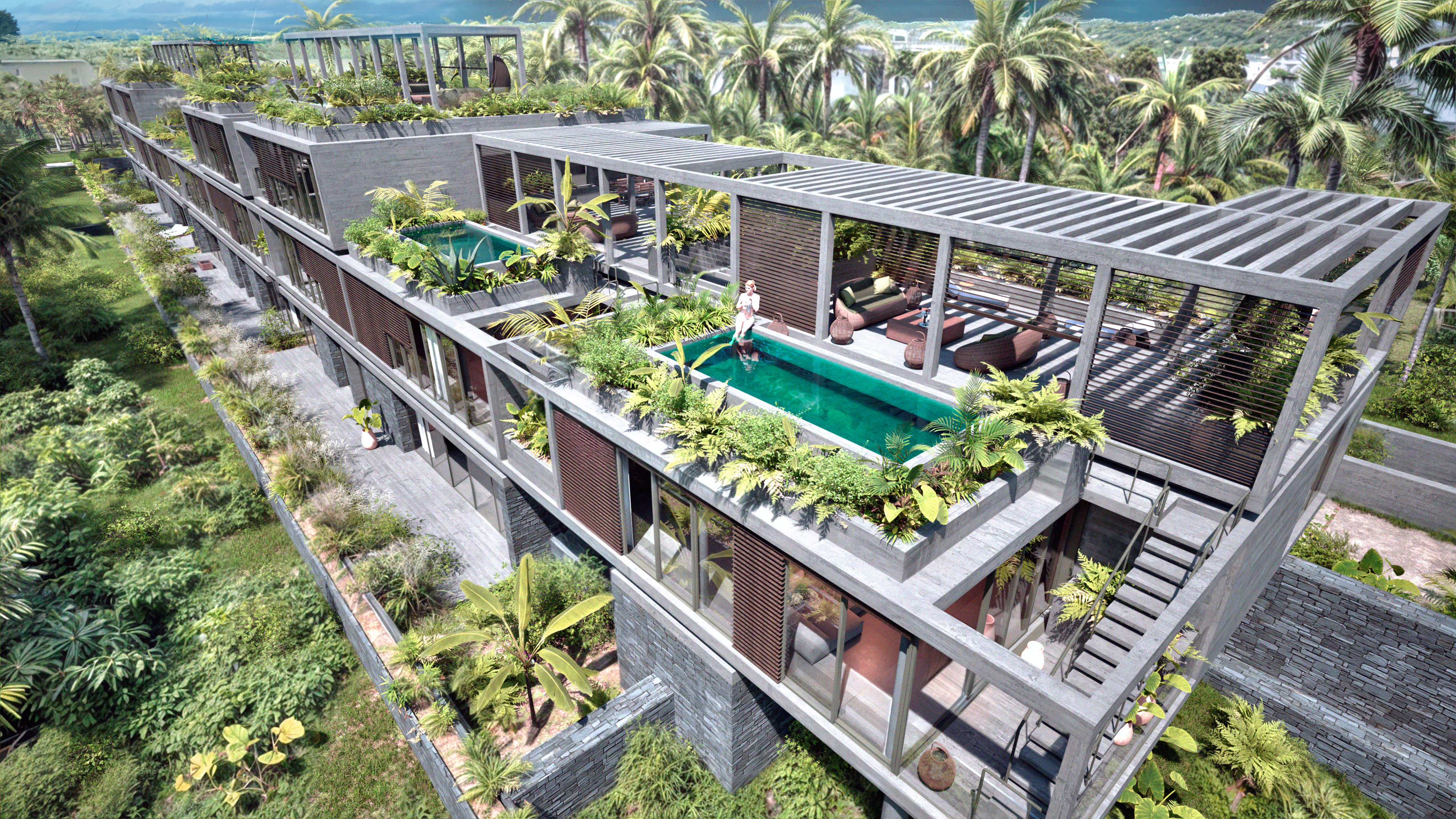 At the top, a series of concrete pergolas extends the structure toward the sky, softening its outline and filtering light across the upper terraces. From mountain to sea, the building sits comfortably in its landscape — grounded, open, and unmistakably of its place.